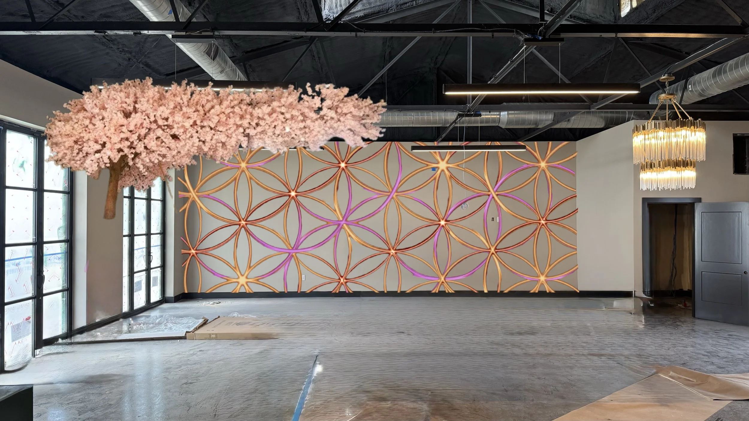 For this mock-up, I made several variations. For The geometric seed of life pattern, I would use an iridescent/ holographic pigment that would change colors and disappear as the perspective and lighting changes through the day. This wall could also be enhanced with UV light and UV reactive paint for night vibes